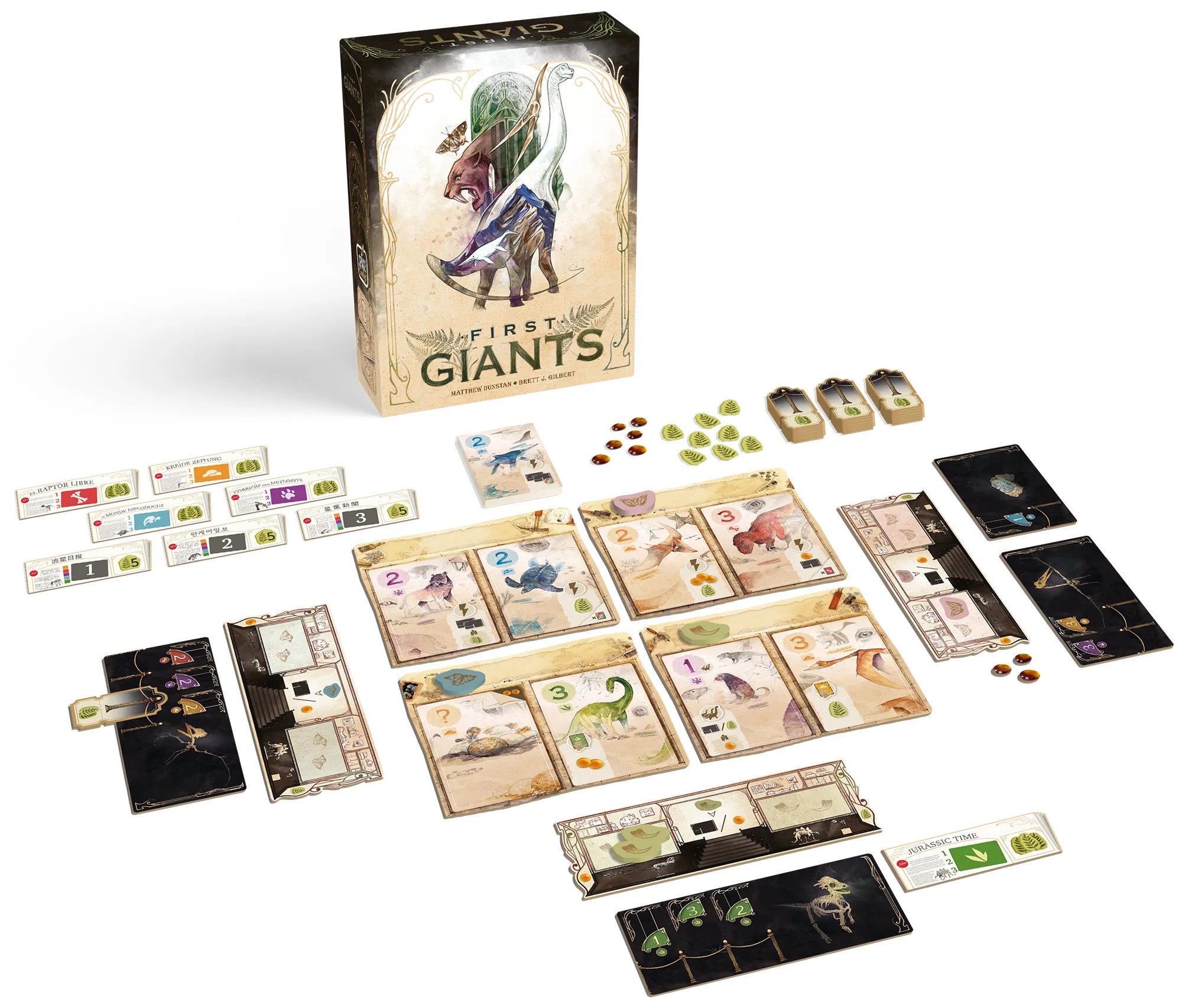 First Giants is a game of set collecting and combinations in which players recruit cards representing dinosaurs, flying reptiles, and giant mammals of various size. These cards have many different powers and you can create powerful combination to earn amber, victory points and the ability to exhibit your fossils.