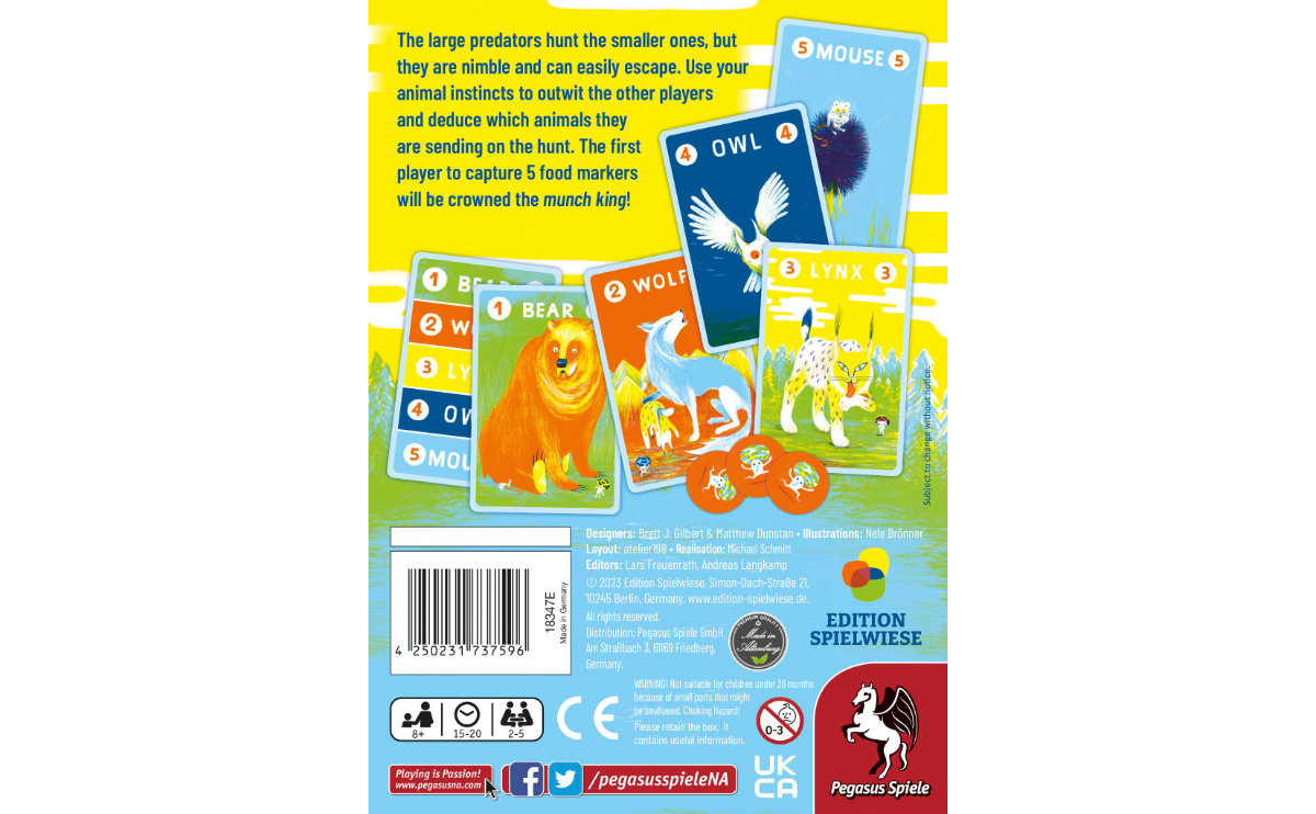 In Prey Another Day you send your animals hunting in the forest. In each turn, you first secretly decide which of your wild animals is going to hunt. Then the ranking of the animals is called and possibly it is now time for a delicious and opulent meal!